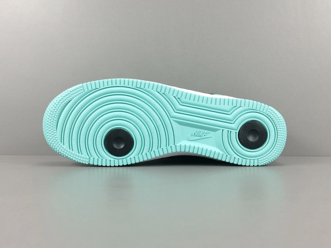 Фирменный бирюзовый оттенок украшает кожаный логотип Swoosh, создавая идеальный контраст с глубоким черным верхом. На язычке красуется элегантная надпись «Tiffany» в курсивном стиле, заменяя привычный логотип Nike Air.
